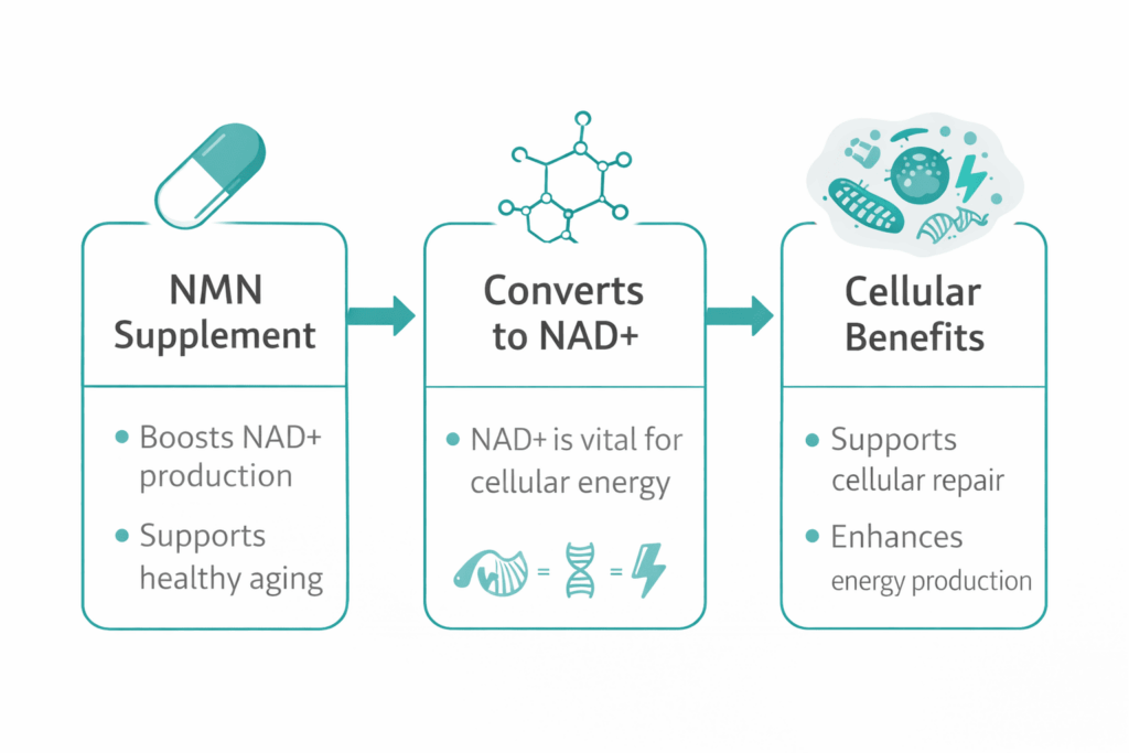 When you take NMN supplements, your body converts NMN into NAD+, theoretically helping maintain these crucial cellular functions as you age.