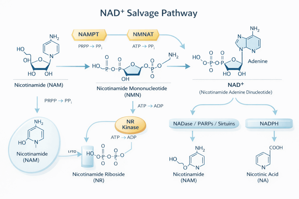 NMN enters cells and is converted into NAD⁺ through the NAD⁺ salvage pathway, which is the main route used by human cells to maintain NAD⁺ levels. Because NAD⁺ is constantly consumed during normal cellular processes, the body relies on precursor molecules like NMN to replenish it.